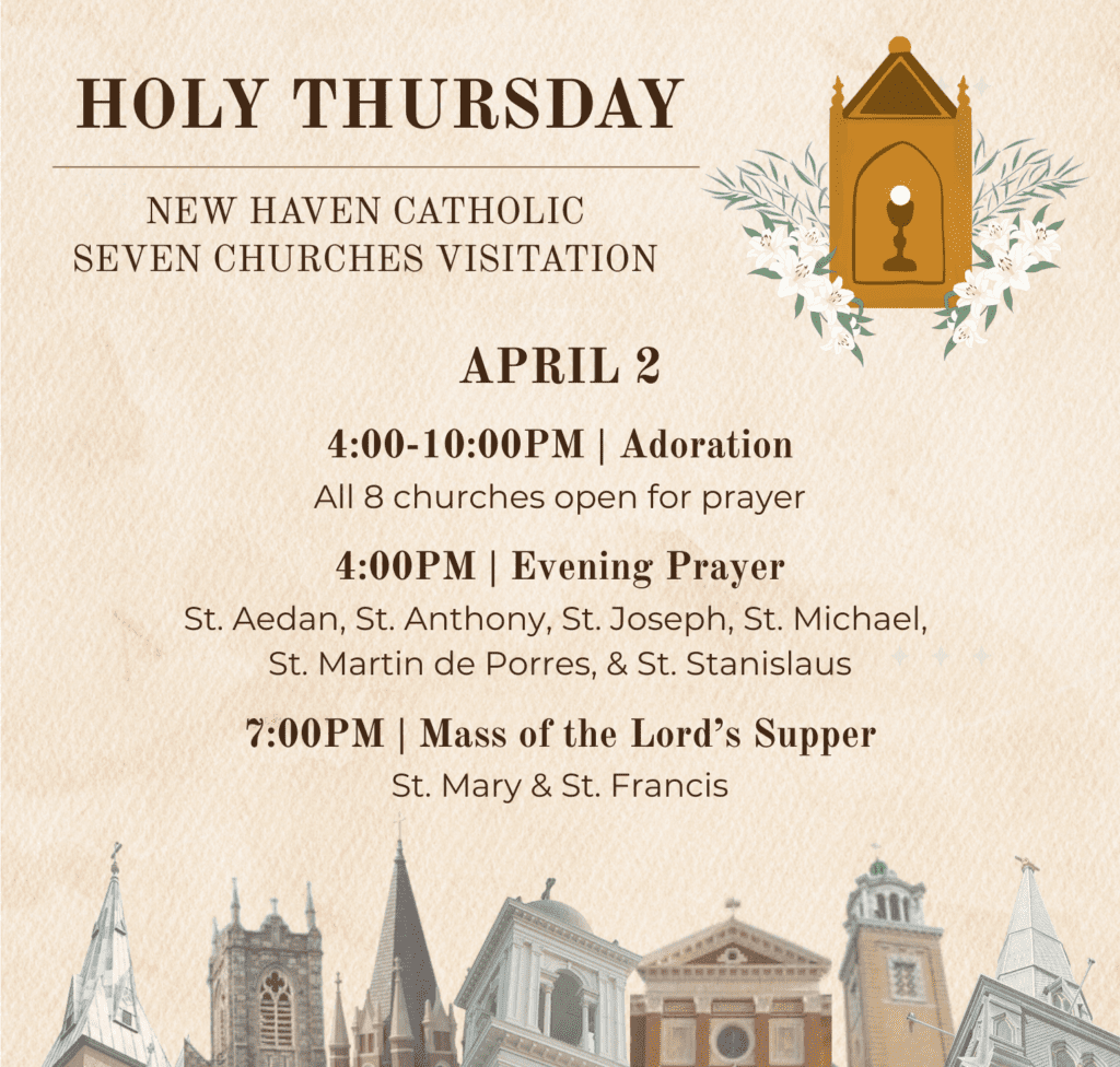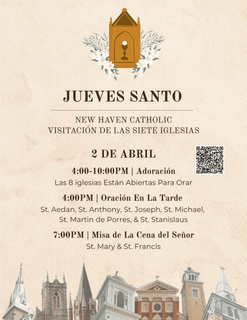 La Semana Santa llega a nosotros como la culminación de nuestra disciplina cuaresmal. Los invito a que retomen la tradición de la Visitación de las Siete Iglesias el Jueves Santo. Los feligreses suelen asistir a una iglesia, pero todos formamos parte de una parroquia más amplia. Descubre la fe y la belleza de nuestra parroquia en su conjunto, imitando los últimos pasos de nuestro Señor hacia el Calvario. En cada iglesia se nos invita a orar ante el especial Altar de Descanso, recordando a nuestro Señor preso y meditando sobre los siete lugares que Jesús visitó entre su Agonía en el Jardín y su Crucifixión. Todas nuestras iglesias estarán abiertas para la oración de 4- 10PM y puedes elegir tu propio camino y el número de iglesias que visitarás. Los Caballeros de Colón actuarán como guardia de honor y saludadores en cada iglesia, y habrá programas con información sobre cada iglesia y las oraciones de la Visitación. Las seis iglesias sin Misa del Jueves Santo tendrán Oración Vespertina a las 4PM. ¡Que este sea un tiempo de gran gracia y unidad en nuestra parroquia! – Padre Dolan